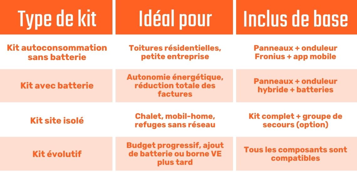 Chaque kit est dimensionné sur mesure selon votre profil de consommation, votre site (résidentiel, isolé, mobile…) et vos objectifs (autonomie, économie, confort).